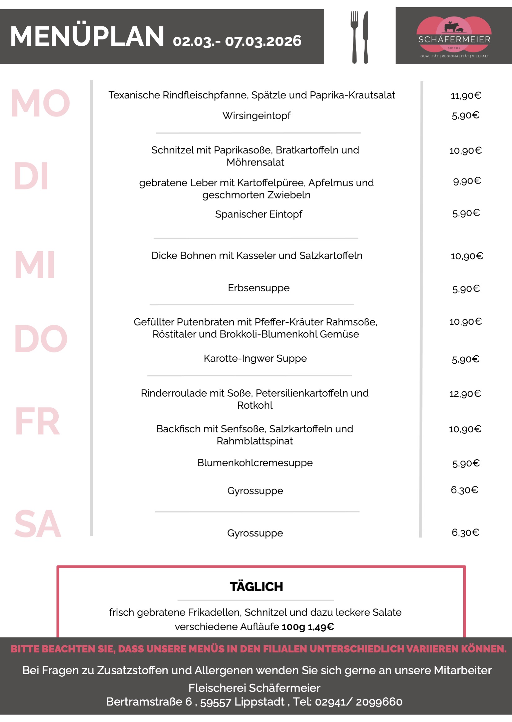 Wochenmenü 02.03. – 07.03.2026 Deftig gekocht. Frisch gemacht. Mit Geschmack. Unser Wochenmenü steht für echtes Fleischer-Handwerk und vollen Geschmack – genau