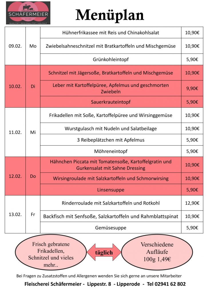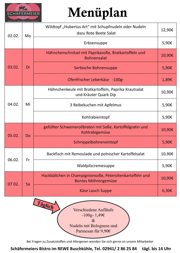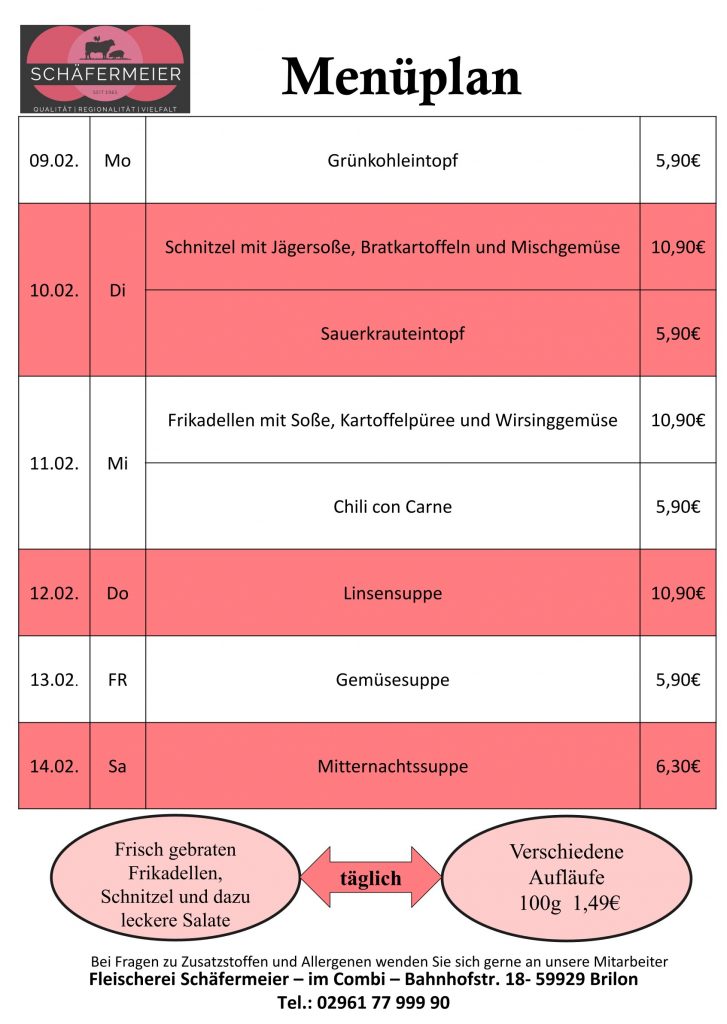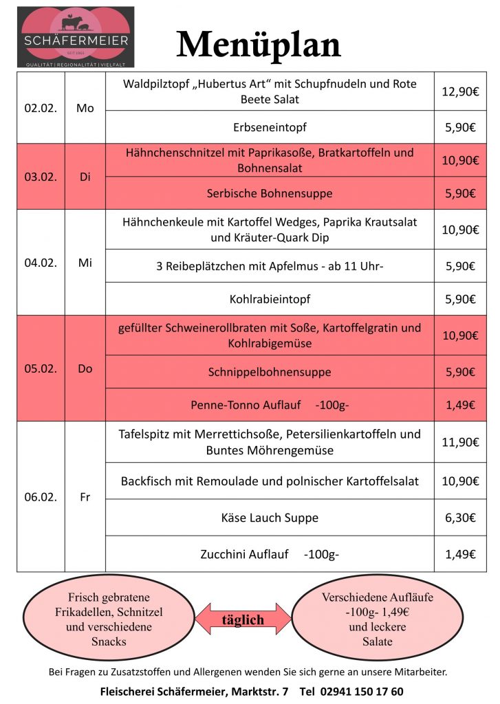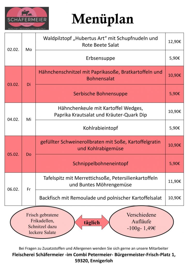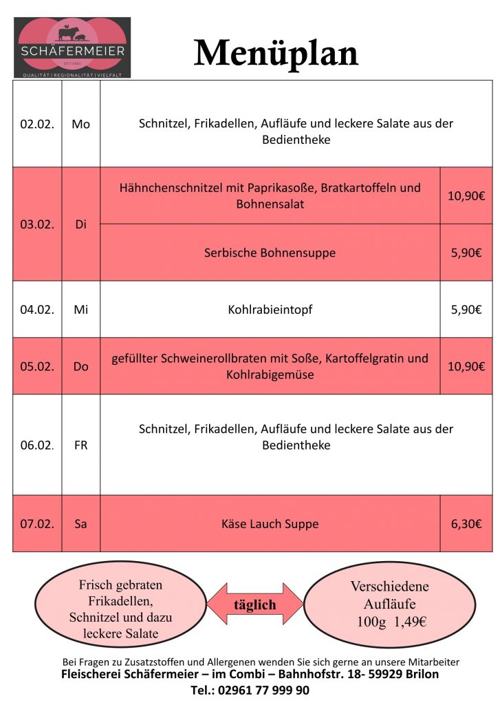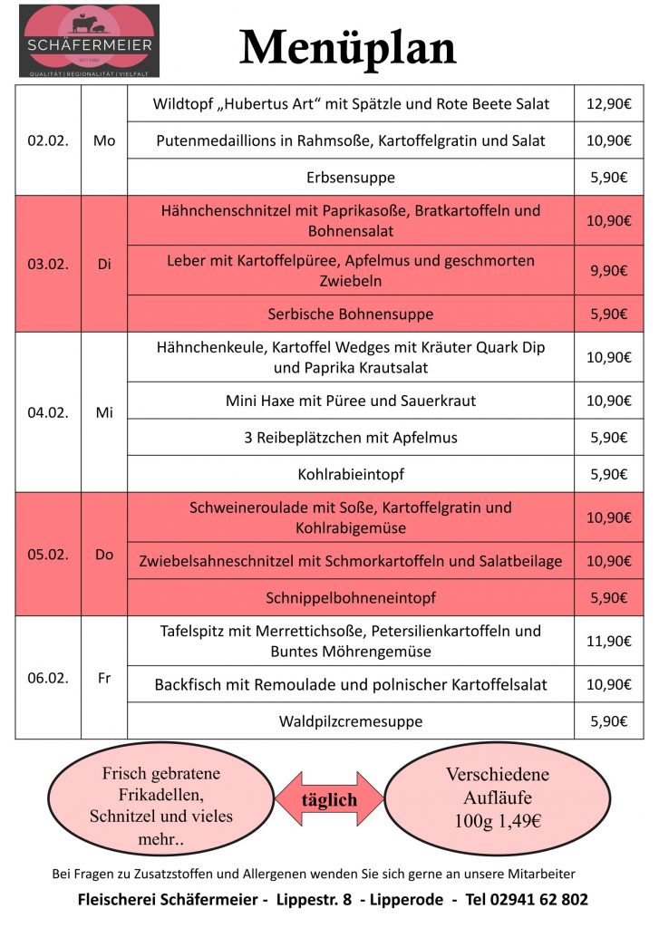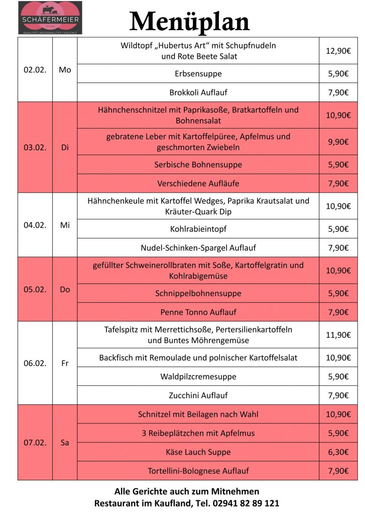 In bekannter Schäfermeier Qualität: Jeden Tag ein neues Menu, das kann nicht langweilig werden.
