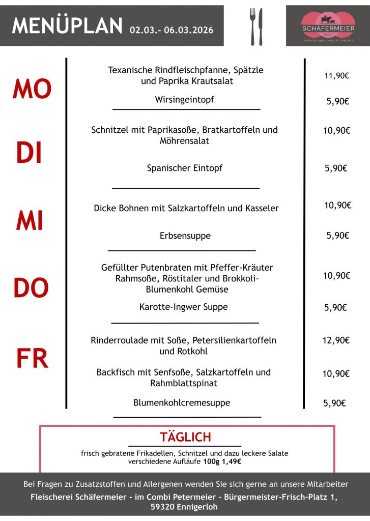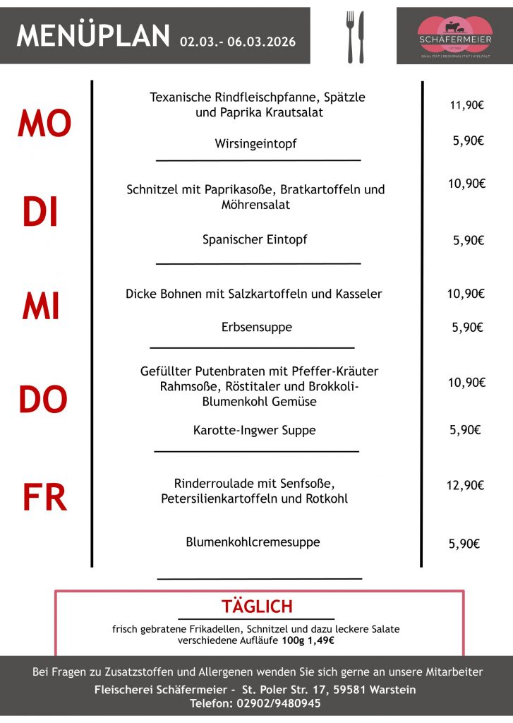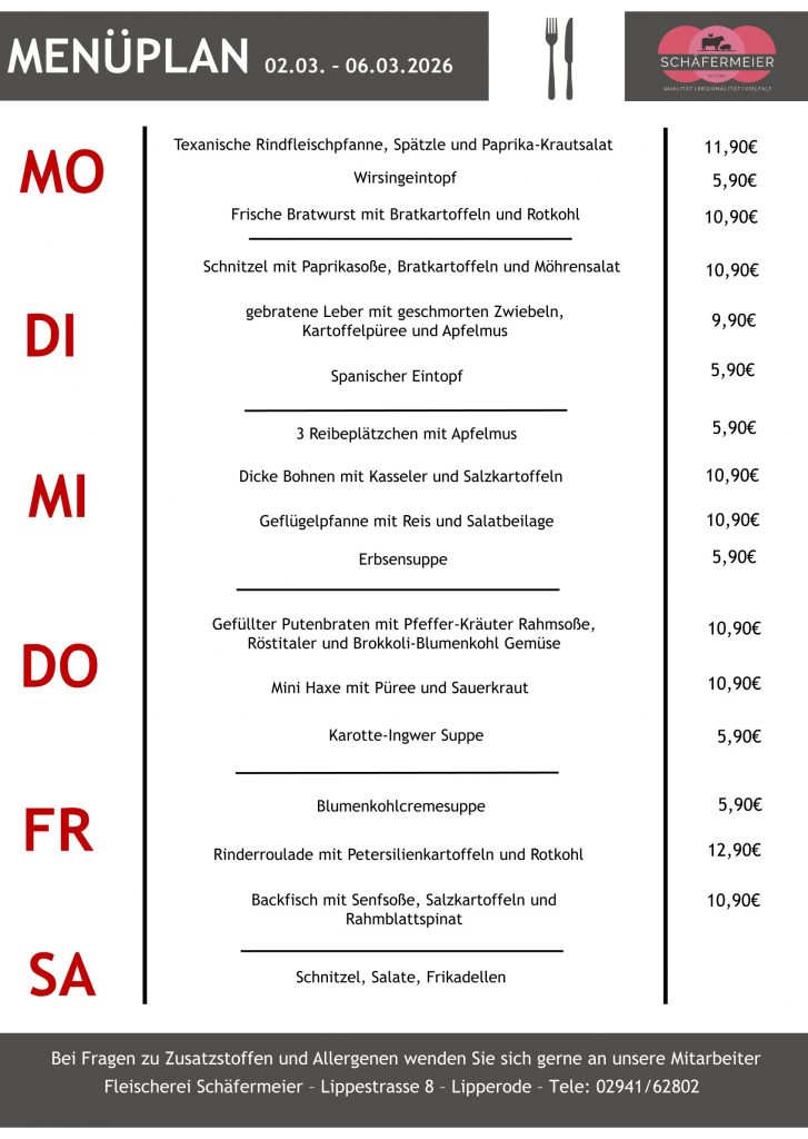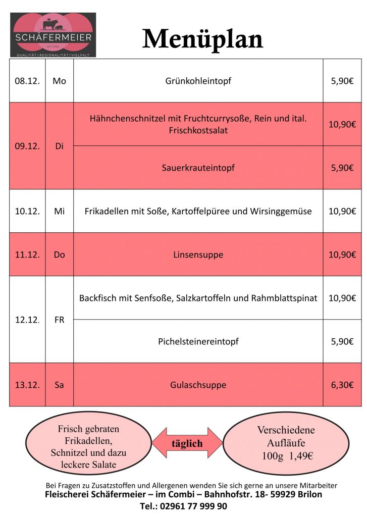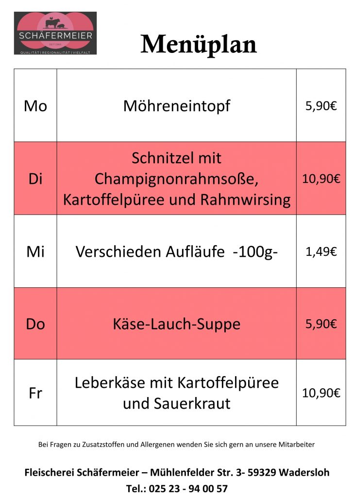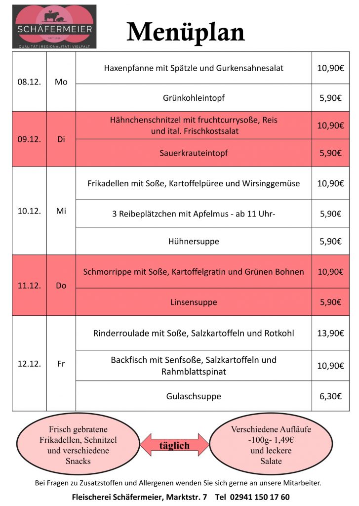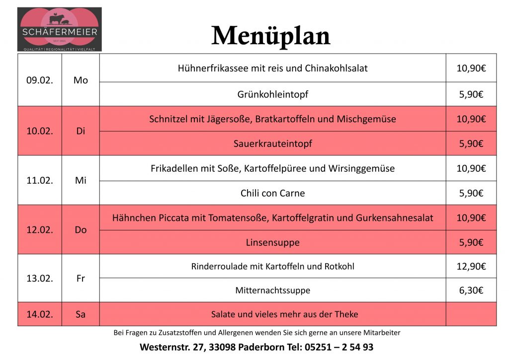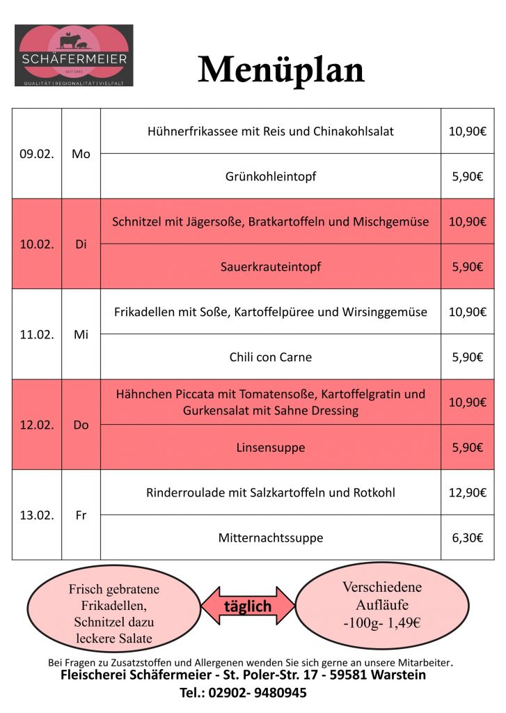 In bekannter Schäfermeier Qualität: Jeden Tag ein neues Menu, das kann nicht langweilig werden.